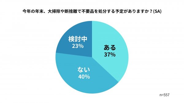 年末の大掃除シーズンは、多くの方が不要品処分への意識が高まるのではないでしょうか。調査実施の11月中旬時点で既に37%の方が不要品の処分予定があることが分かりました。