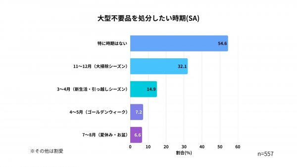 不要品の処分については、「特に時期はない」と答えた人が半数以上(54.6%)を占めました。特定の時期に限らず、ライフスタイルの変化やモノの破損といったきっかけで突発的に処分ニーズが発生しやすいことが示唆されます。一方で、「11~12月(大掃除シーズン)」も32.1%が意識しており、時期によるニーズの変動も存在することが分かります。