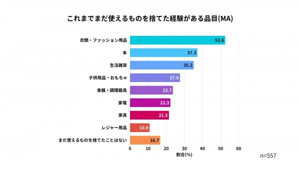 8割以上の人がまだ使えるものを捨てた経験があることが分かりました。品目別では、「衣類・ファッション用品」が半数以上(52.6%)でトップでした。これに「本」「生活雑貨」「子供用品・おもちゃ」「食器・調理器具」が続き、売却しづらい、または売却しても大きな利益になりにくい品目が上位を占めています。