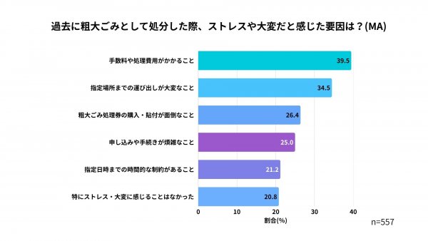 粗大ごみ処分時のストレス要因は、「費用」と「手間」に集中しています。最も多かったのは「手数料や処理費用がかかること」(39.5%)であり、「お金を払って捨てる」ことへの抵抗感が強いことが分かります。