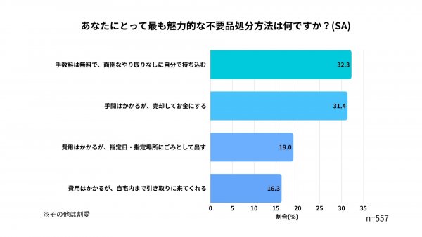 最も魅力的な不要品処分方法は、「手数料は無料で、面倒なやり取りなしに自分で持ち込む」が32.3%でトップとなり、「手間はかかるが、売却してお金にする」(31.4%)をわずかに上回りました。金銭的なリターンよりも「簡単さ」「無料」「やり取りの煩雑さがない」といった要素も、リユース行動を後押しする重要な要因になっていることを示しています。