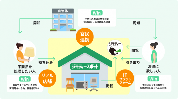 - 市民が不要品をスポットに持ち込み 。持ち込まれた物品はジモティーに掲載・店舗に陳列され、必要とする方へ譲渡・販売。